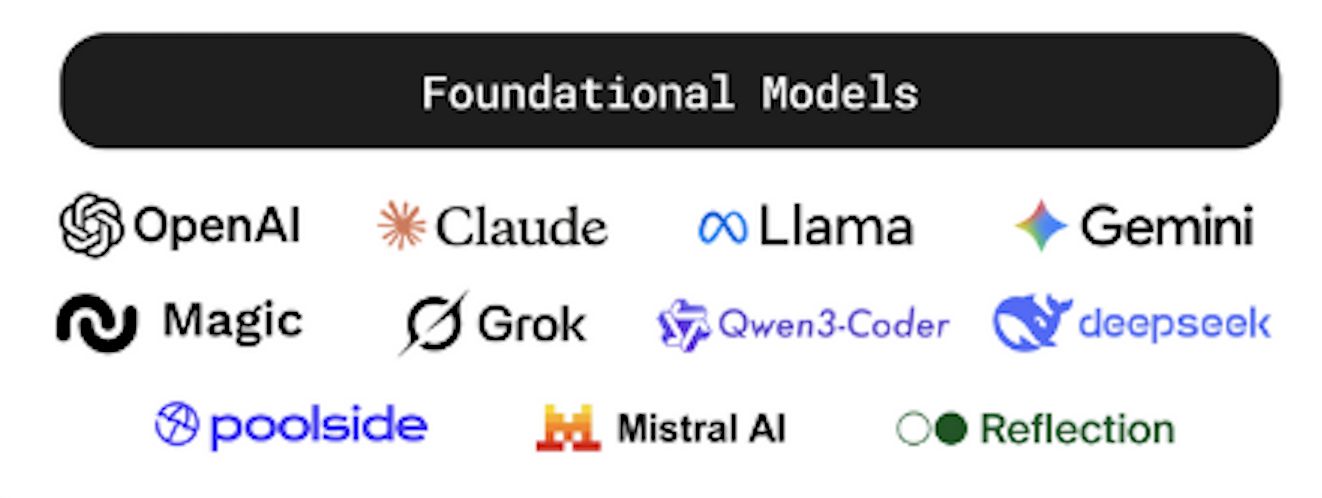 OpenAI, Claude, Llama, Gemini, Magic, Grok, Qwen, DeepSeek, Poolside, Mistral AI, Reflection