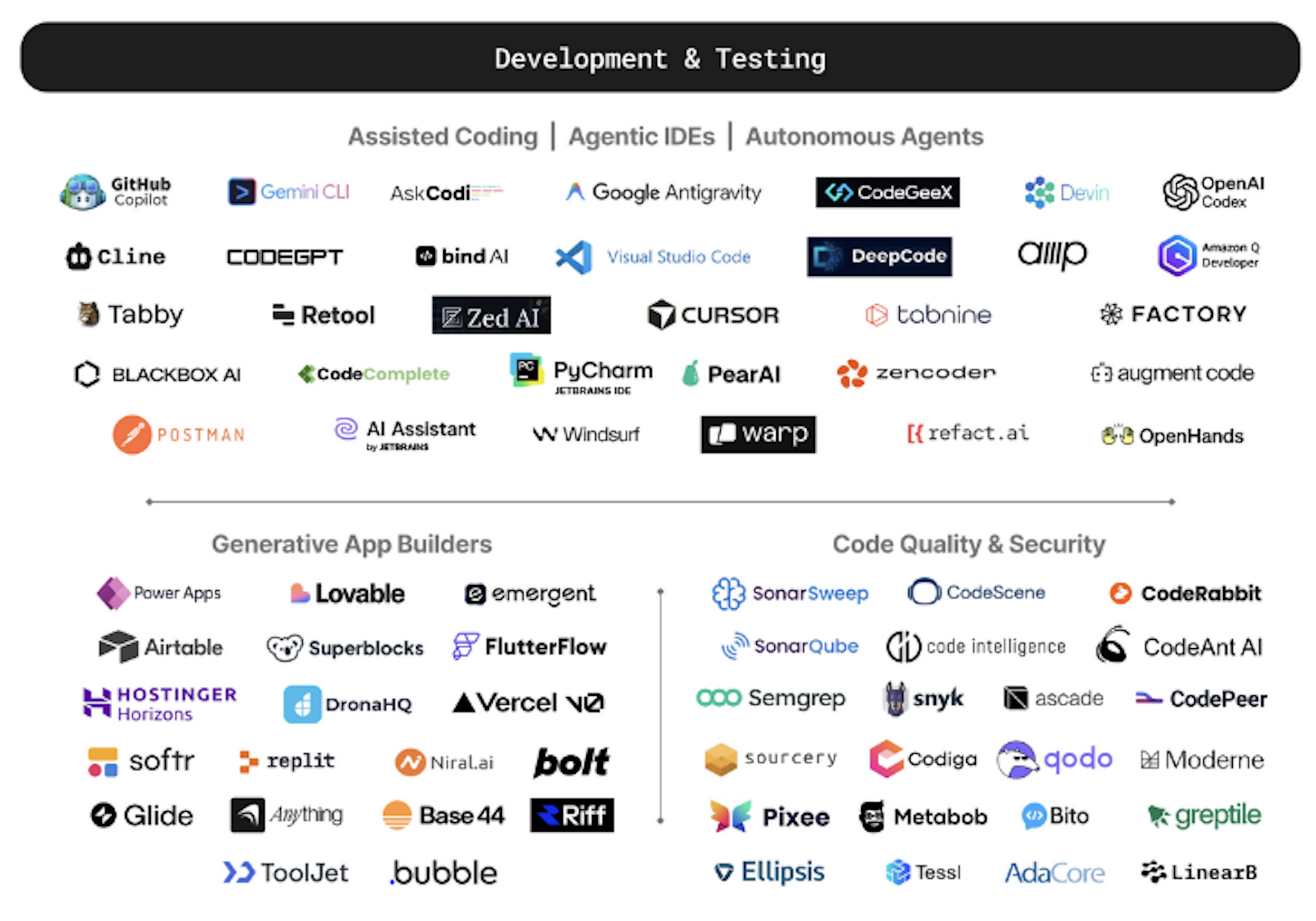 Assisted Coding | Agentic IDEs | Autonomous Agents GitHub Copilot, Gemini CLI, AskCodi, Google Antigravity, CodeGeex, Devin, OpenAI Codex, Cline, CodeGPT, Bind AI, Visual Studio Code, DeepCode, Ellipsis, Amazon Q Developer, Tabby, Retool, Zed AI, Cursor, Tabnine, Factory, Blackbox AI, CodeComplete, PyCharm, PearAI, Zencoder, Augment Code, Postman, AI Assistant by JetBrains, Windsurf, Warp, Refact.ai, OpenHands