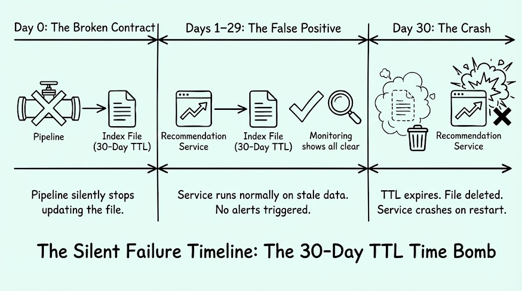 We had a critical recommendation service that relied on data produced by an offline pipeline. The contract between these two systems wasn't an API call; it was a file transfer. The service required an index file to be loaded into memory on startup. If that file didn't exist, the service crashed.