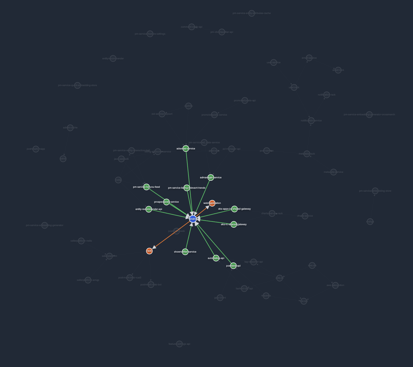 The nodes in this graph represent system components (services, databases, cloud resources like AWS RDS, third-party dependencies). The edges map the relationships between them.