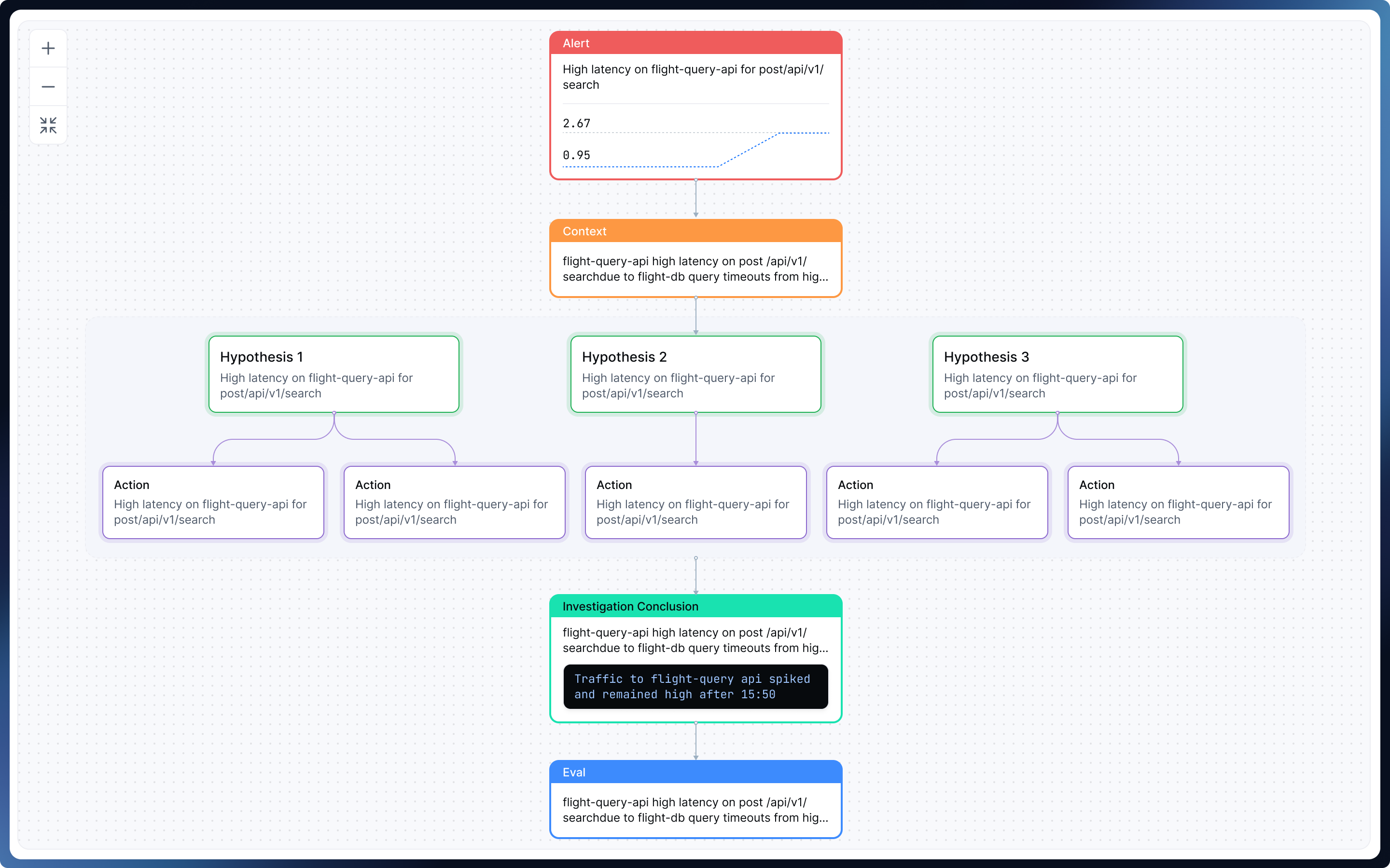 - Context-Based Hypotheses: For novel issues, the agent uses its understanding of the system architecture to form relevant hypotheses based on the current context (e.g., a recent deployment or a failing dependency).