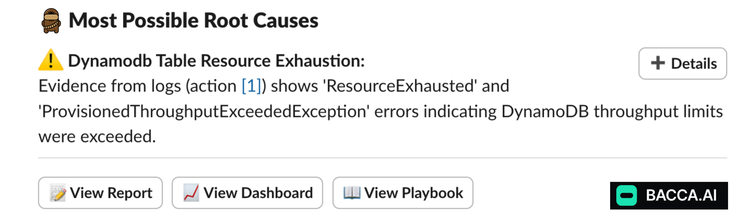 This allows the AI SRE to present a validated hypothesis backed by evidence. Instead of saying, "Here is a similar past incident," bacca says, "The root cause is likely DynamoDB throughput exhaustion because I am seeing 'resource exhausted exception' errors in your logs right now, correlated with a spike in read QPS. Here’s the link."